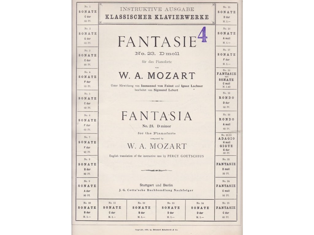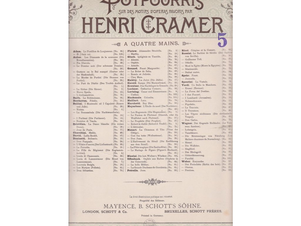 Soubor klavírních skladeb : Die verkaufte Braut = Prodaná nevěsta – Potpourri I+II, Sextetto ; Mozart – Fantasie No. 23. D moll ; Margarethe (Faust) ; 17 leichte Compositionen von Jacob Schmitt