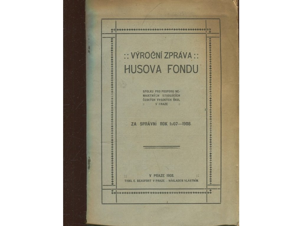 Výroční zpráva Husova fondu - spolku pro podporu nemajetných studujících českých vysokých škol v Praze, za správní rok 1907-1908